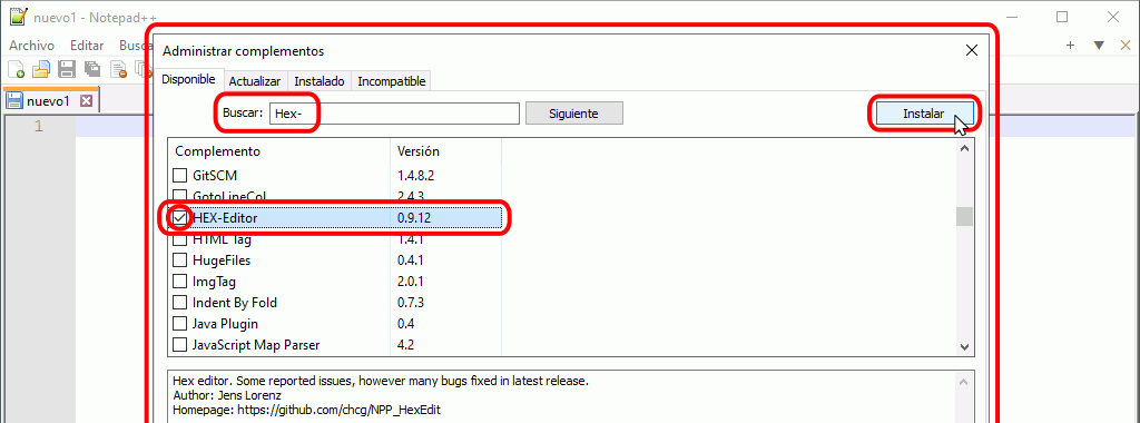 El plug-in Hex-Editor original se encuentra en el repositorio de plug-ins de SourceForge, pero El administrador de plug-ins de Notepad++ utiliza el fork HexEdit que se encuentra en GitHub.